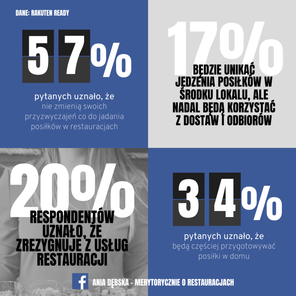 Aż 57% osób stwierdziło, że nie zamierza zmieniać swoich przyzwyczajeń dotyczących jadania posiłków w restauracjach. Tylko co piąta osoba uznała, że zrezygnuje z nich, ale wciąż będzie korzystać z dostaw i odbiorów osobistych. Podobna grupa osób uznała, że nie będzie w ogóle korzystać z usług restauracji, a 1/3 skupi się na przygotowywaniu posiłków w domu.